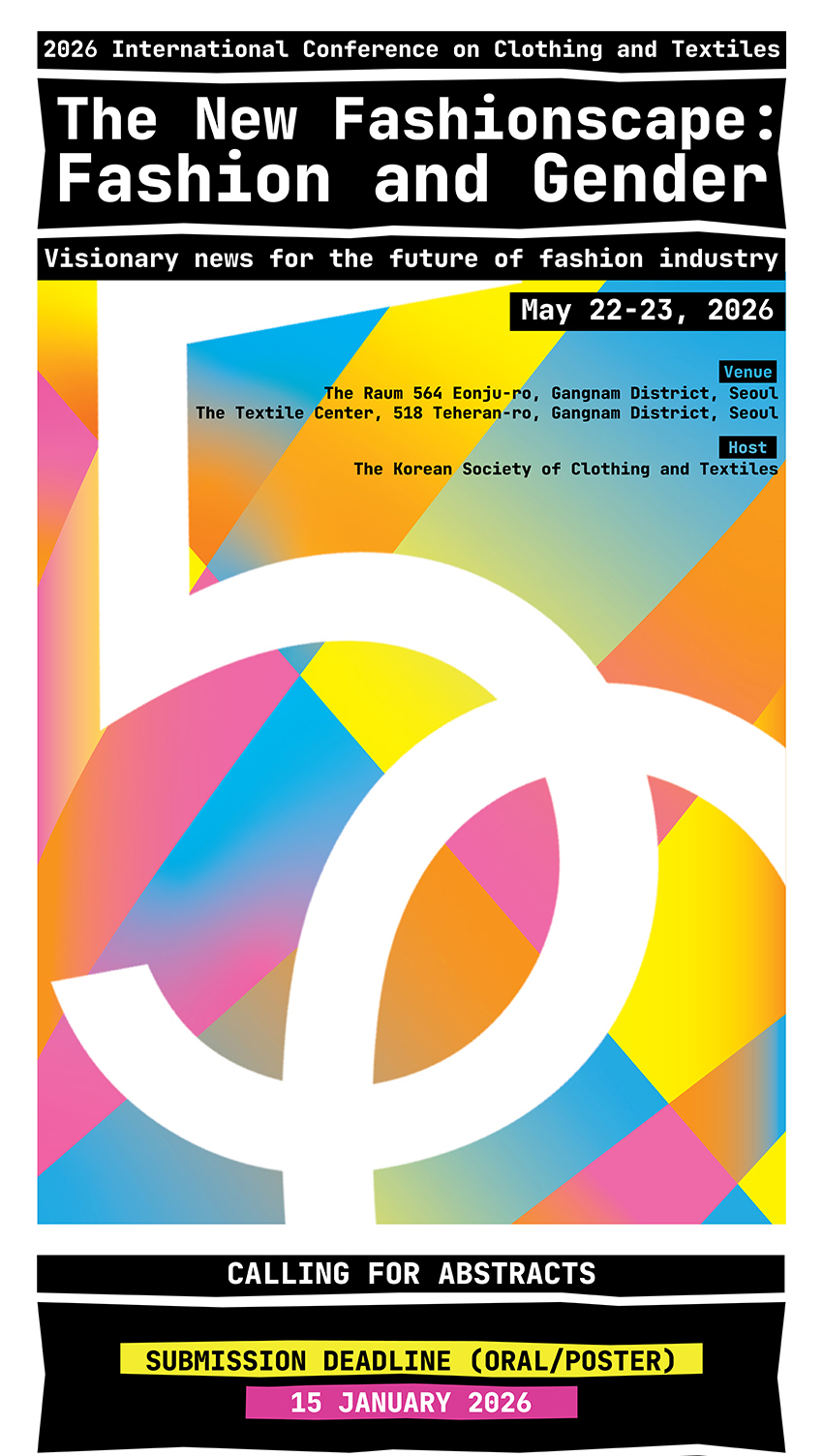 The Korean Society of Clothing and Textiles (KSCT) is pleased to invite you to the 2026 International Conference on Clothing and Textiles (ICCT) to be held on May 22-23, at the Textile Center, Gangnam District, Seoul. Korea. The ICCT held successfully in 2020, 2022 and 2024, and again calls for abstracts for oral and poster presentations, and graduate students’ research competition. The year, 2026 is more meaningful to mark the 50th anniversary of the establishment of the KSCT. The KSCT, is the largest educational and scientific organization for the field of fashion and textiles in Korea, and its primary goal is to advance research and education for academicians and industry practitioners in this field.